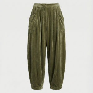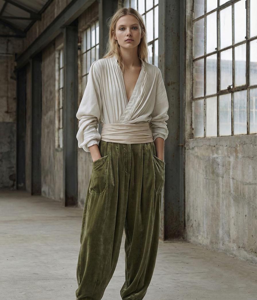 & Free ShippingUn estilismo de silueta fluida que combina una camisa plisada en tono crudo con pantalones bombachos de terciopelo verde. El conjunto equilibra la estructura de un fajín ancho con la caída relajada de tejidos lujosos.
