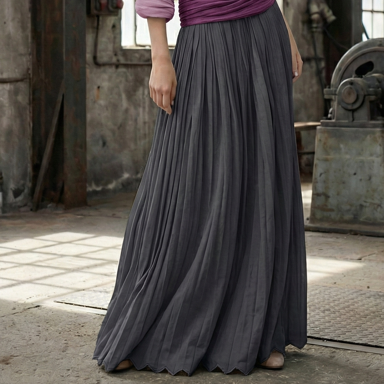 Falda larga plisada de seda en gris antracita. Presenta un plisado ancho y fluido que otorga gran movimiento, confeccionada en un tejido con cuerpo y acabado mate.