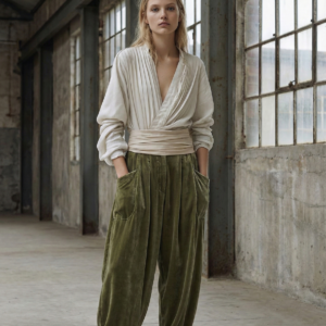 Pantalón fluida en un tono grisáceo, suave y elegante.