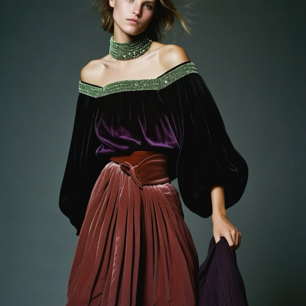 Un fajín de terciopelo en color marrón envuelve la cintura, aportando estructura al look.